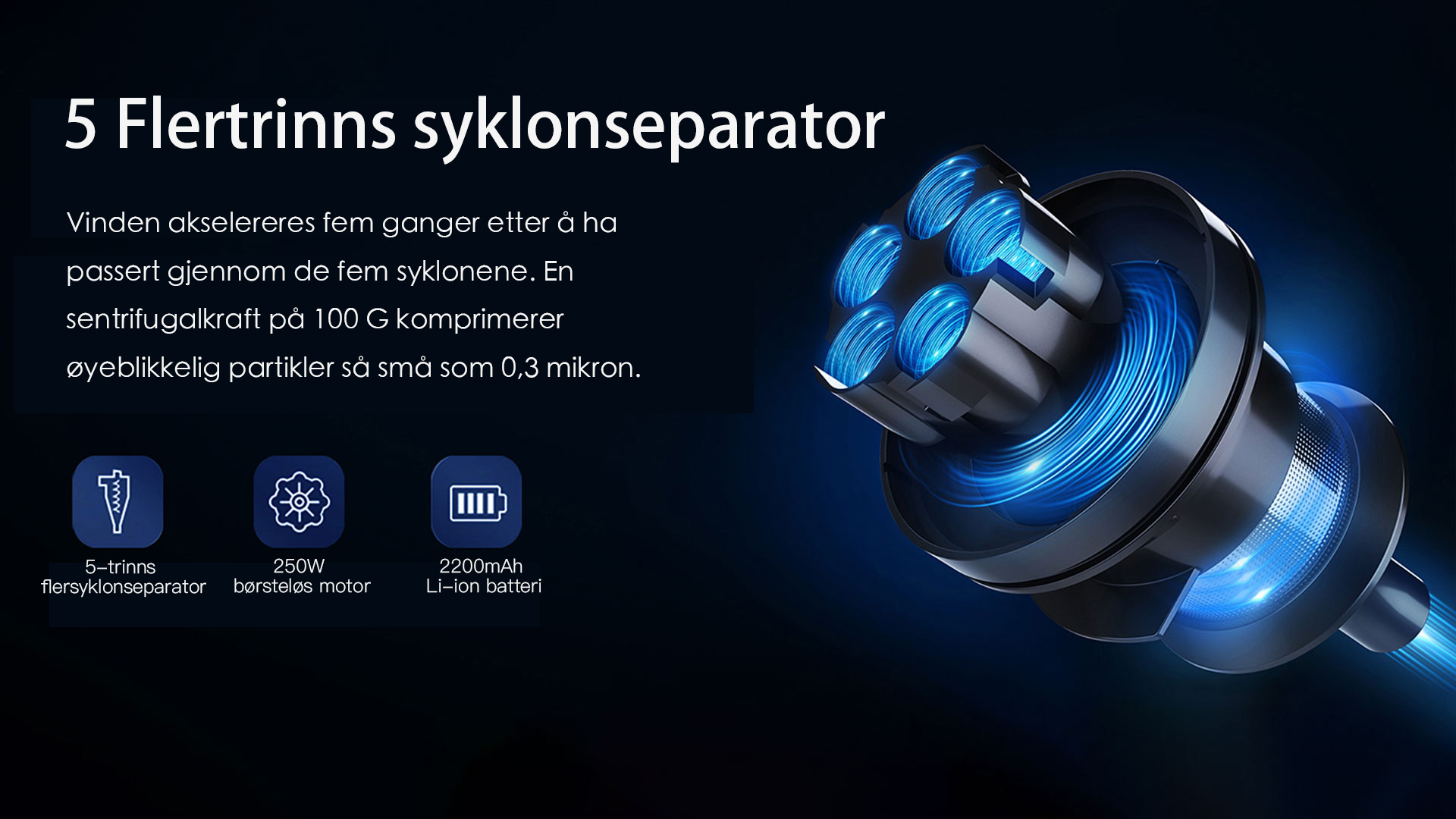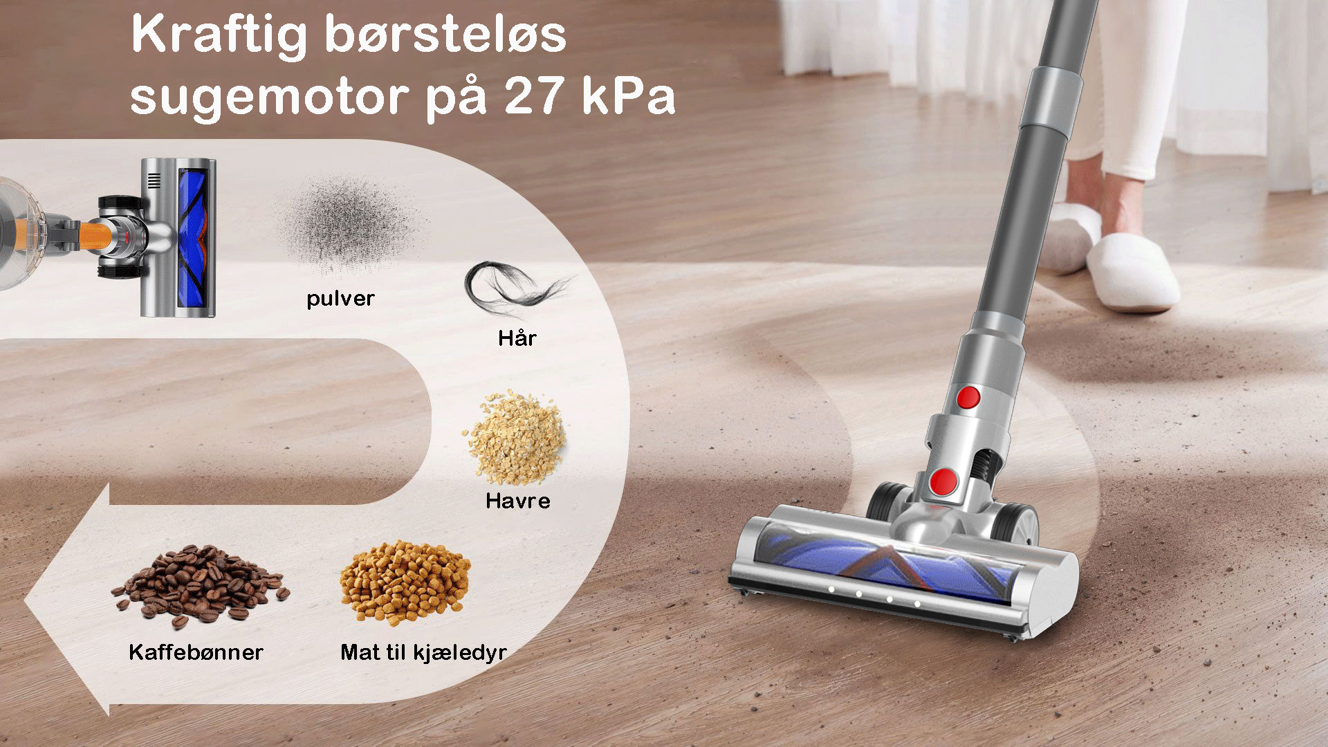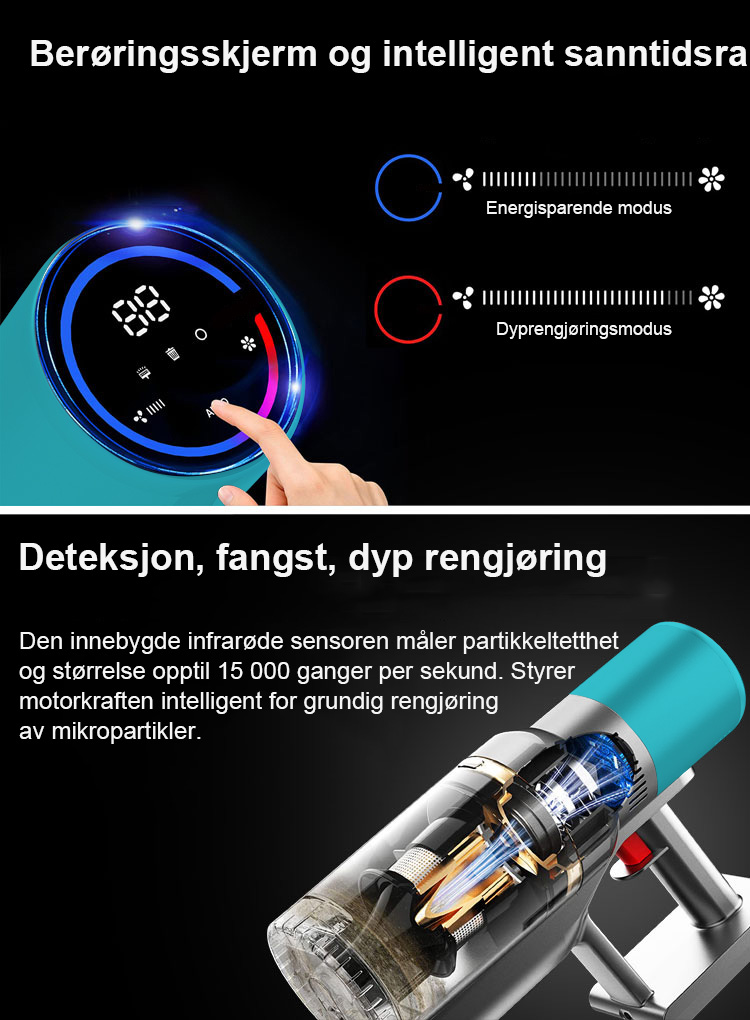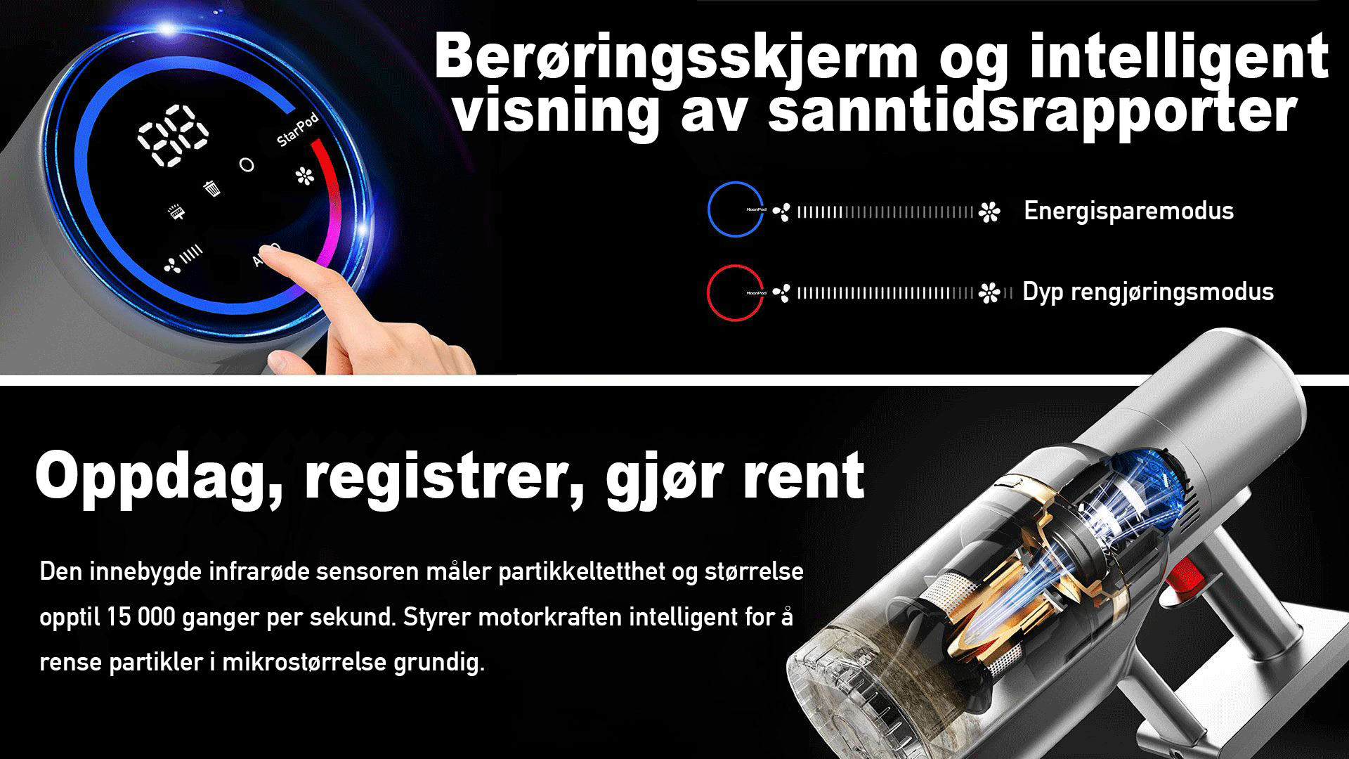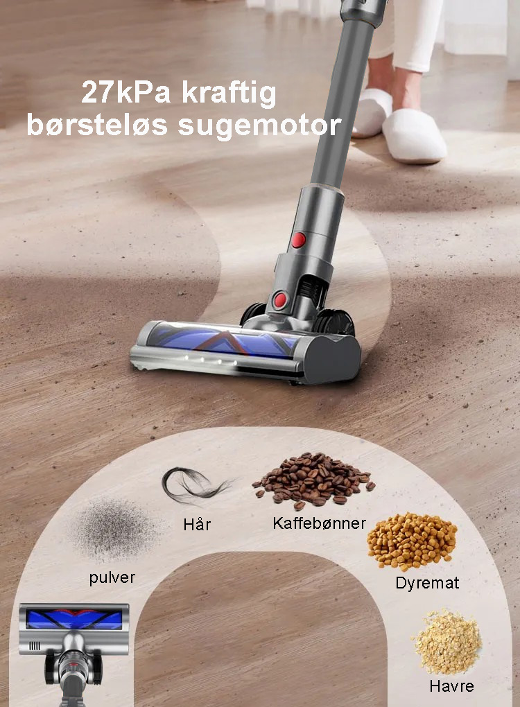 StarPods X9-motor når over 135 000 o/min og leverer en sugekraft på over 27 000 Pa. Fjerner nesten alt støv effektivt.